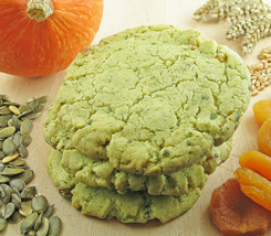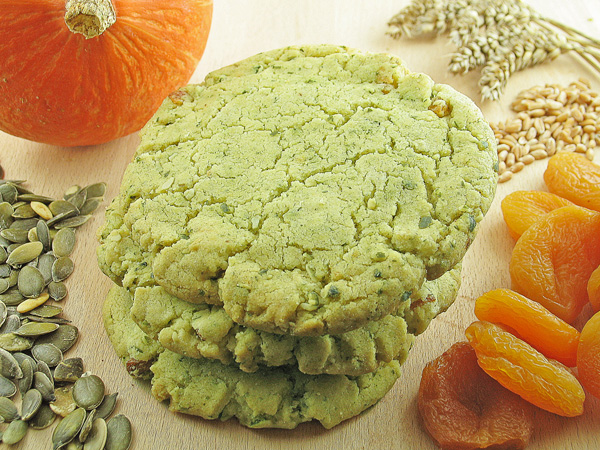 Zutatenliste (PDF)Veganer Cookie aus Dinkelmehl, Kürbiskernen und Aprikosen.