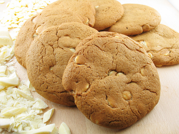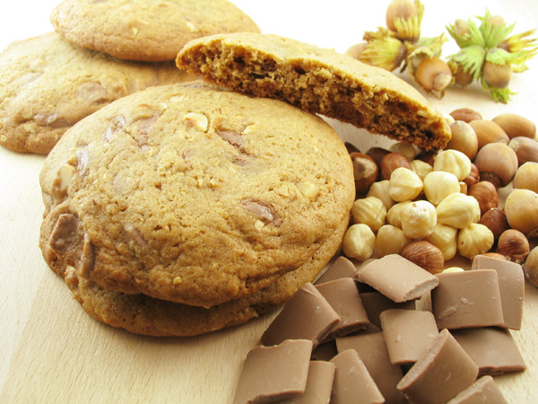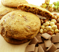 Zutatenliste (PDF)Heller Cookie mit Milchschokoladen-Stückchen und gerösteten Haselnussstückchen.