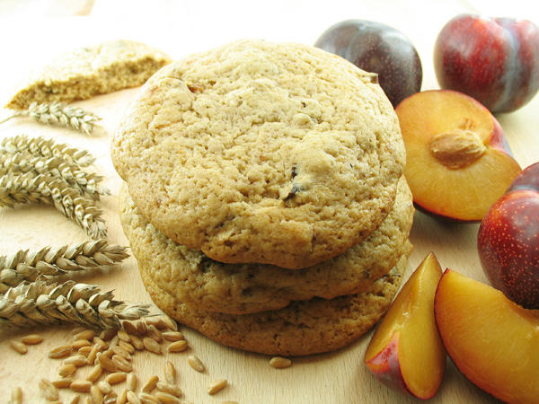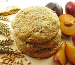 Zutatenliste (PDF)Heller Cookie aus Dinkelmehl, mit getrockneten Pflaumen und Pflaumenmus ebenfalls vegan.